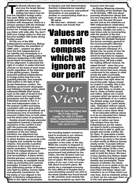 The hoisting of the Zambian flag on 24 October, 1964 was about pursuing wholesome values that are very important in life.